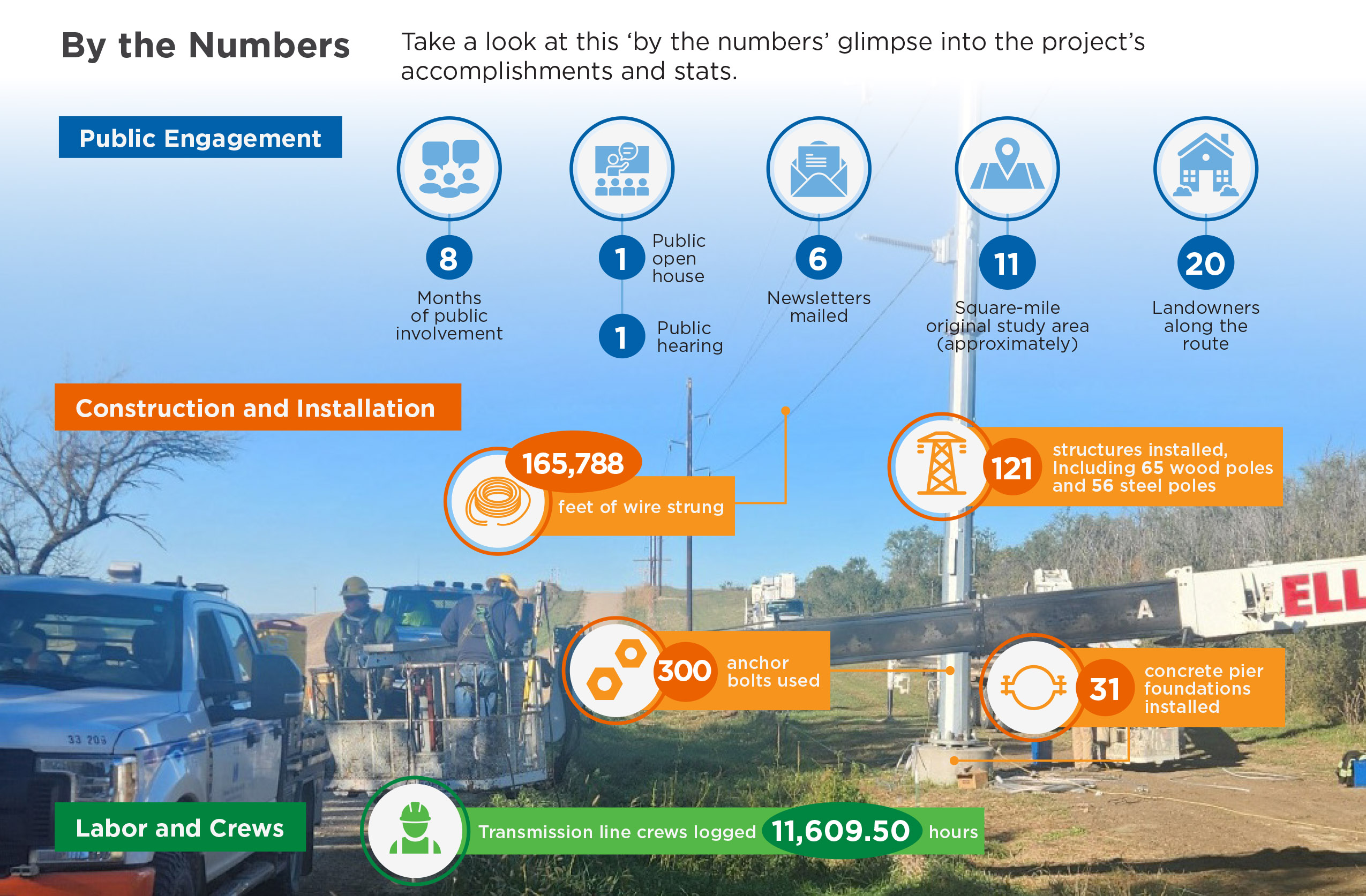 We appreciate the cooperation of the landowners and the public throughout this entire process. As they say, “It takes a village.” Thank you to HDR Engineering (engineering services), Dietzel Enterprises Inc. (foundation support), Norfolk Tree Care, LLC (tree clearing), JEO Consulting Group (survey services), Westwood Professional Services (aerial survey services), Irby Utilities (steel poles), Wesco (line conductor), Terracon (soil borings), and to Stanton County Public Power for relocating its distribution line.
